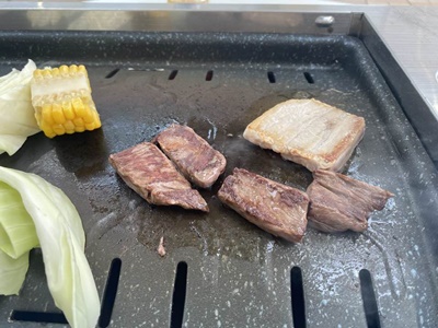 12時15分になったのでバーベキューに。風は強いが(3m)雨は止んでおり、そもそも屋根の下なので問題なく食べれた。ご飯冷めるの早かったけど。