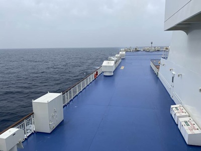 14時半まで寝ちゃった。残り6時間かな。現在位置は浜松の沖。今から2時間半後に伊豆半島、さらに約2時間で横須賀って感じか。すぐだな。おっさん達はもう宴会やめてた。今から一眠りして出発に備えるのかな?14時とかまで飲んでたらアルコール完全には抜けてないと思うけど。ちなみにフェリー側は到着6時間前で売るのお断りらしい。そこがデッドラインなわけね。