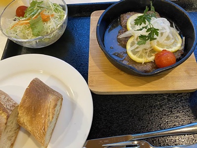 と思ったら43分には「ご用意できました」のアナウンス。早速行って、佐世保レモンステーキのセット。1800円。船内で焼いているというパンがおいしかったのでパンに。