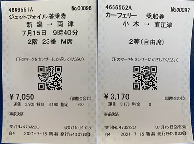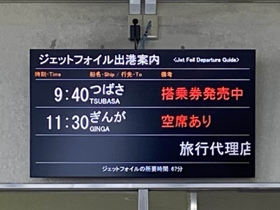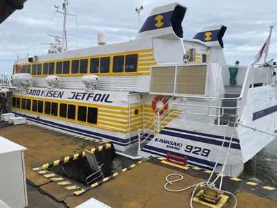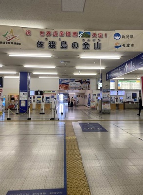 ちょっと渋滞してたが予定の9時12分に佐渡汽船バス停着。ジェットフォイル出発は40分なので余裕。船によっては何十分か前に来るの要求されるので妙にビビるが普通の船はそんなことない。