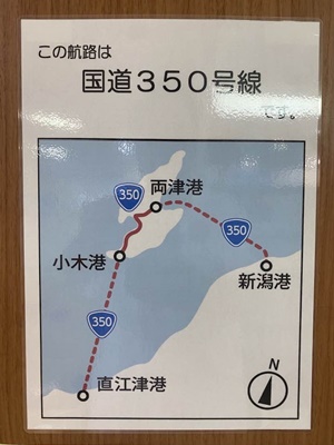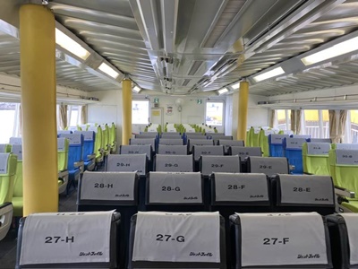 客席。ジェットフォイルは乗船中シートベルト着用で、ふらふら歩き回ったりできないようだ。よく考えたら昨日のうちに佐渡に渡ってたら観光にも余裕ができたんじゃないか?まあ佐渡に安い宿あるか調べてもいないし、昨日の夕食がいまいちだったのでの話だが。