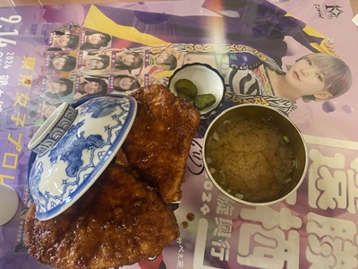 テーブルにも今日の興行のポスター。ソースカツ丼は新潟のに比べてタレが甘辛く、味も濃い。カツは2枚。45分には食べ終える。