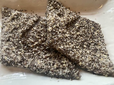 はっとうUP。そば粉ともち米を練ってゆでたもの。ちょっと甘め。表面についてる荏胡麻も会津の名産。