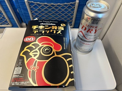 7時1分に東京駅着いて。駅弁屋 祭で複数のYouTuberが買ってた「チキン弁当デラックス」購入。値段が通常のチキン弁当の1.5倍なのでビビる。ぷらっとこだまのクーポンは朝からだがやはりビールに。12分にホームに上がるとこだま705号はもう入線してて乗車可能。