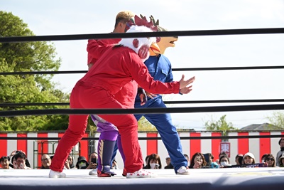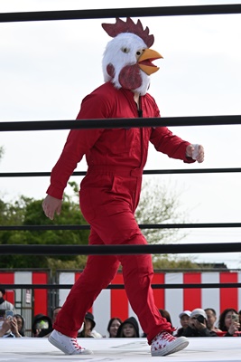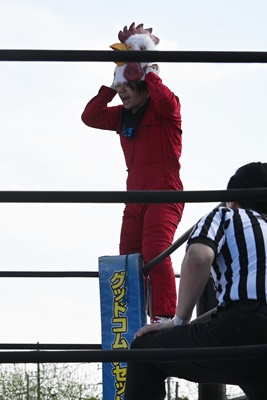 コーナーに上って鶏マスク着けると(右写真)「コケーッ!」と叫んで、