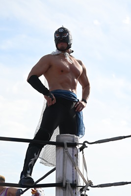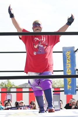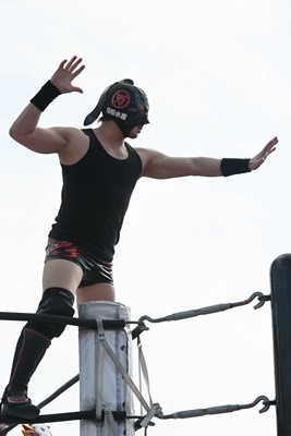 アジャ鰻マスクをコーナーに振って突っ込む、鰻マスクカウンターのキックからコーナーに上ってミサイルキック(右写真)、スーパー鰻マスクにタッチ。