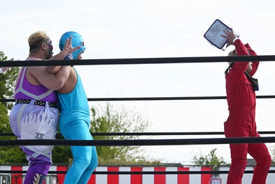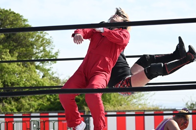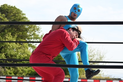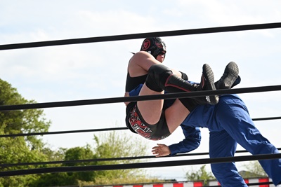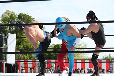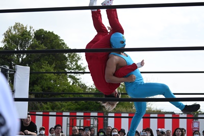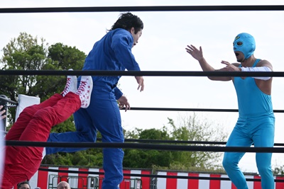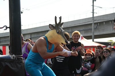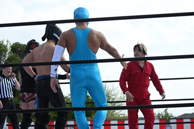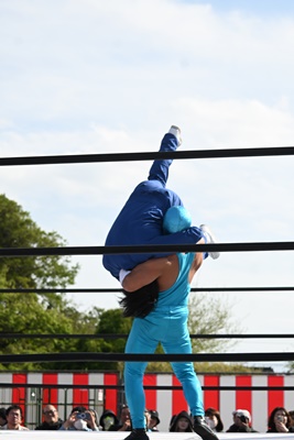 首の取り合い、腕の取り合いから高鹿がフライングメイヤー(右写真)、スーパー鰻マスクヘッドシザーズでブレーク。シシャモパワーと勝俣にタッチ。