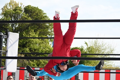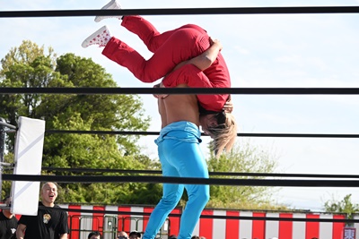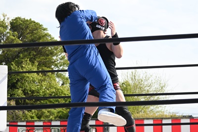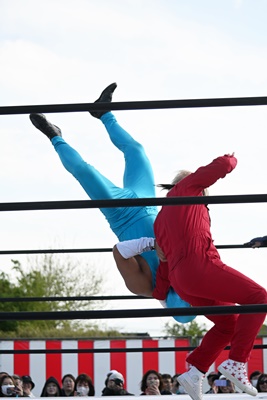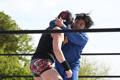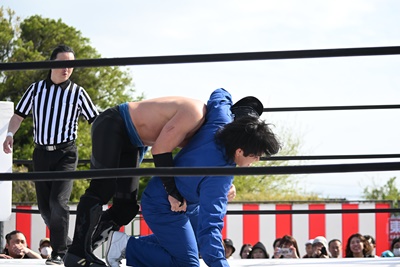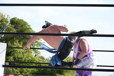 勝俣ロープに飛ぶ、シシャモパワーはリープフロッグをキャッチして水車落としに(右写真)。シシャモパワーロープに飛ぶ、高鹿が足をすくって場外に引っ張り出す。