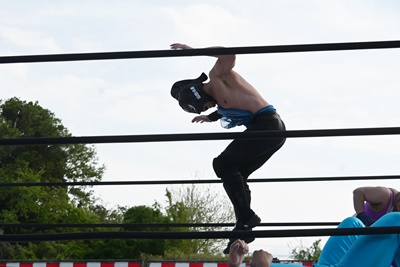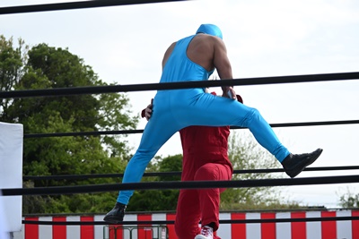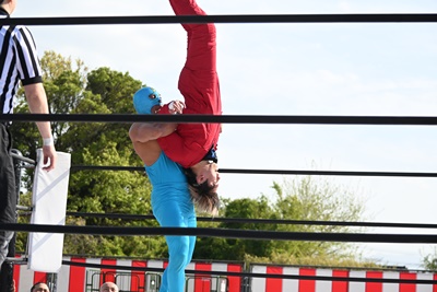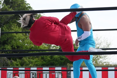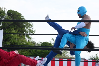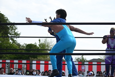 スーパー鰻マスクトップロープから飛んで(右写真)