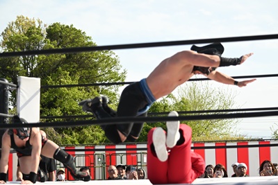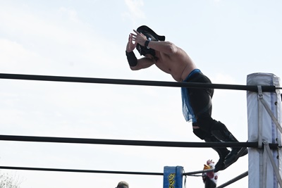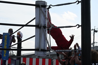勝俣魚軍目掛けてトペ・コン・ヒーロ(右写真)。「場外乱闘ー!」と高らかに宣言して場外乱闘開始。