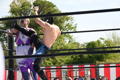 ロープワーク、勝俣はシシャモパワーのリープフロッグを読んでリバースアトミックドロップに(左写真)。