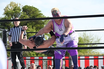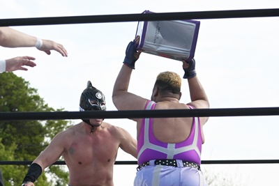 高鹿のブレーンバスターをフィッシャーマンズバスターに切り返し(左写真)、鰻マスクにタッチ。