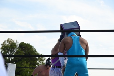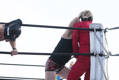 バックの取り合いからシシャモパワーが勝俣をコーナーに押し込む、そこにスーパー鰻マスク串刺しエルボー(右写真)、