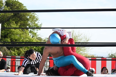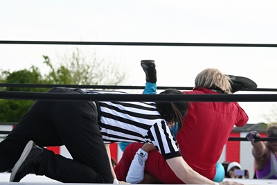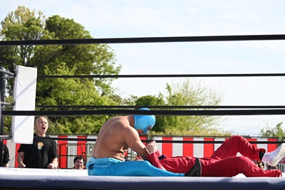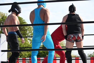 三番目にシシャモパワーが突っ込んでくるが勝俣は回転エビ固めに切り返す(右写真)、カウント2。
