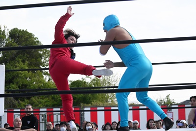 高鹿エルボー(右写真)、打ち合いに。鰻マスクはジャンピングハイキックからロープに飛んでランニングエルボー。