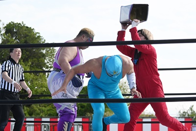 勝俣トラースキック(左写真)、鰻マスクが入って2人にエルボー。