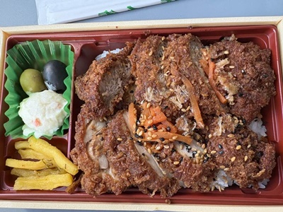 8時過ぎに水平飛行に移ったので空弁食べる。今日の空弁は「笠原流醤油かつ重」。