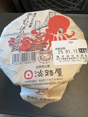 NHKのニチアサ番組見て9時にチェックアウト。明石駅ビル内の「淡路屋のおもうつぼ」という駅弁販売&食事処で冬のひっぱりだこめし買う。