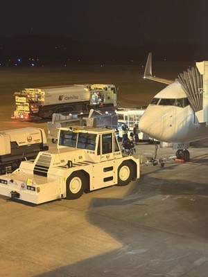 岡山桃太郎空港着陸は10分遅れの9時40分。岡山駅行バスは55分発。