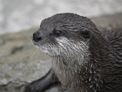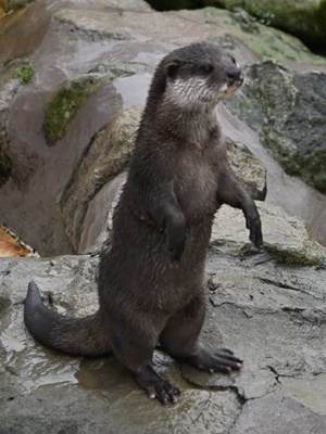 カワウソのいるふれあい広場に。カワウソは水辺の動物だから雨でも平気。