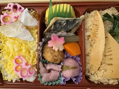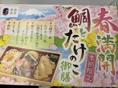 彦根過ぎた辺りで空腹感出てきたので駅弁食う。春満開鯛とたけのこ御膳。