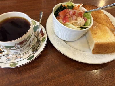 なんとか座れたのでコーヒーとモーニング(1品無料、2品目以降50円〜100円追加)。