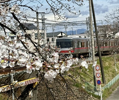 河川環境楽園行きのバスまで時間があるので線路脇の桜で花見。