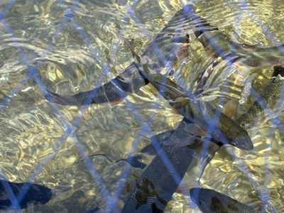 木曽川に住む魚に餌をやれるコーナー。カワウ被害防止のためネットが掛けられていた。