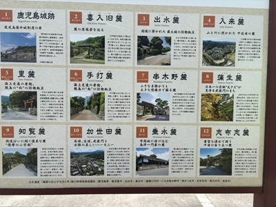 鹿児島城と11の麓(喜入・出水・入来・里・手打・串木野・蒲生・知覧・加世田・垂水・志布志)。知覧しか行ってない。里と手打は甑島にあるらしい。