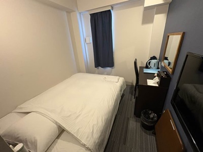 コンビニもなさげなのでスーパーでビール買って帰る。ホテル室内。スモールルームなので狭い。とりあえず風呂。今日は24000歩も歩いたしなあ。