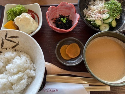 で、空港3階のCOSMOSで冷汁定食。チキン南蛮でも地鶏でもなかったんだよなあ、気分が。
