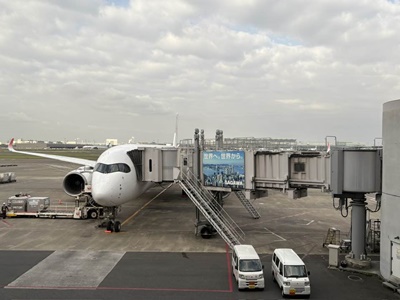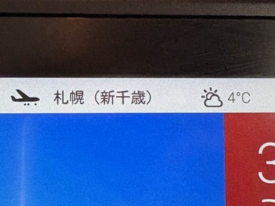 A350-900は初めてかな?札幌便は需要あるんだなあ。イス多くしてる分(最大391席)通路と座席は狭い。座席のモニタに「札幌4℃」と出る。タイツも持って来た方が良かったか?30分に動き出す。45分滑走開始。