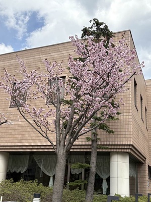 建物の前の桜は満開。何ザクラかは不明。