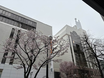 その先に丸井今井が見えたのでマルセイバターケーキ買いに行く。ここにも桜が咲いてた。