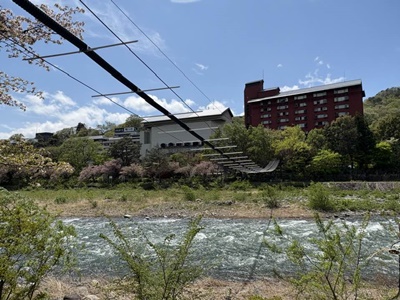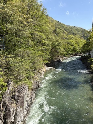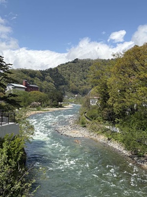 湯原橋を渡ると温泉街に。空が青で川の色もそれを映して水色だと素晴らしい景色に見える。