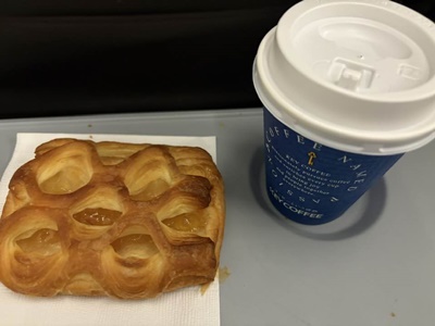 「500円の買い物券がある」と言われたのでありがたくアップルパイとコーヒーいただく。まだfrequent flyerだったのだな。