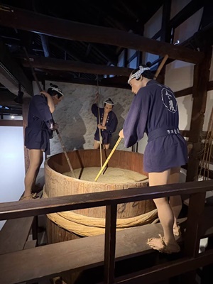 「酛づくり」。蒸米と水と麹と酵母(昔は家つき酵母、蔵つき酵母のみ)を合わせて撹拌、乳酸菌を抑えて酵母を繁殖させる。なんで麹と酵母が両方いるのかわからん。麹が糖を作って、酵母がその糖をアルコールにするんだったっけ?(もやしもんのかすかな記憶)