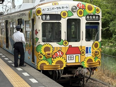 12時42分の電車で栗林公園に。みいちゃんが乗った「ひまわりだらけの電車」だ。ユニバーサルホームのラッピングだけども。腹の調子は収まった様子。参道に薬屋なかったし。
