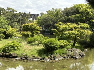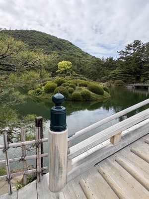 偃月橋。南湖がやっぱり「借景」という言葉がぴったりでいいなあ。
