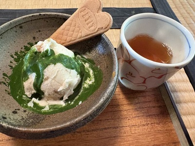 しょうゆ豆アイスと抹茶のアフォガート。お茶飲んでたら「先日園内でイノシシが捕獲されました。まだ他のイノシシがいるかもしれません」という驚愕のアナウンス。