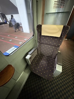 1人掛けグリーン席。電源はなし。人気の車両だけど古いからなあ。