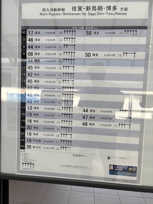 西九州新幹線のダイヤ。本数多くない。17時44分のかもめ50号乗車。