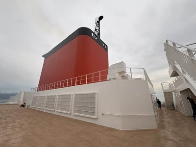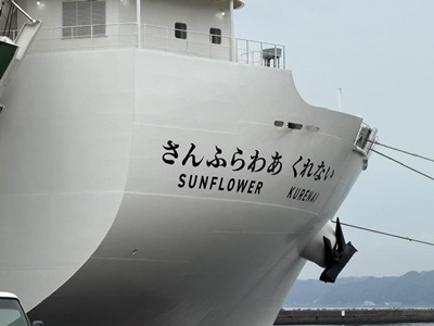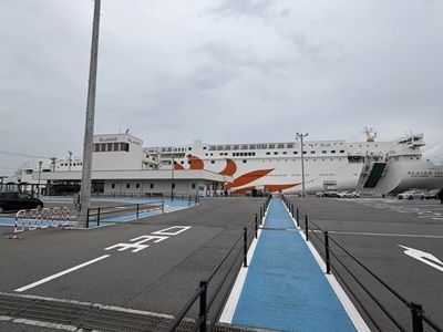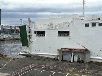 部屋に戻ると6時。着岸は6時35分とのことだが、降りれるのはもうちょっと後のようだ。39分にまず大型車下船開始。と思ったらすぐに徒歩下船案内。降りる。折り畳まれた自動車乗込口はこんな感じか。