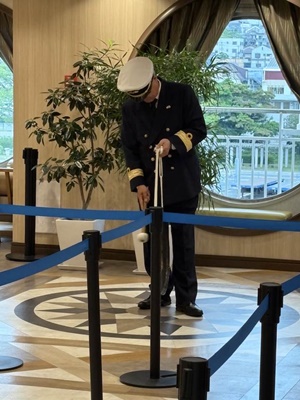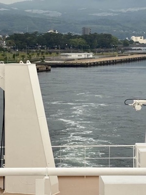 出航10分前の銅鑼。あ、酔い止めは出航30分前に呑まなきゃなんだった。今呑もう。