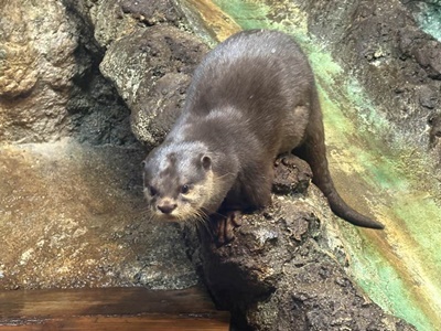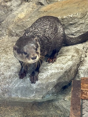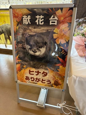 最初に自然動物館に。久しぶりで行き方忘れてて暑い中歩く羽目に。しかもまだ掃除中でカワウソ出てなかった。階段を下りてメインのカワウソ舎に。その前にはヒナタへの献花台。