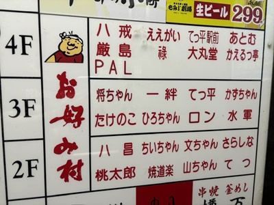 「カープ鳥」の店舗一覧検索し、本店が休みなのを知る。中の棚店は「不定休」。行ってみると月に一度の休みが今日。駅前店も「不定休」だが電話すると出ない。これは仕方ない、とお好み村に。