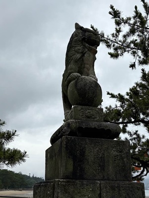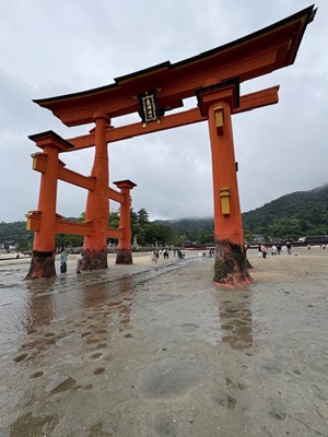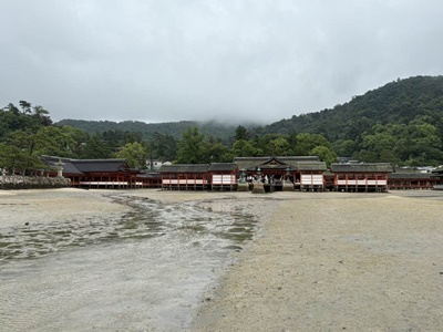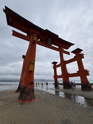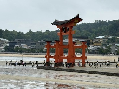 潮が引いてるので鳥居の下には人がたくさん。さっき船から見たときははいなかったから1時間半で引き潮が進んだのだろう。