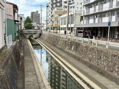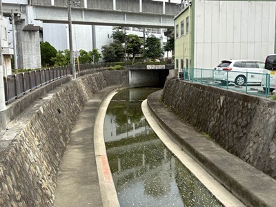 新川。浜松古城もこの川から水堀に水を引いていたと思われる。