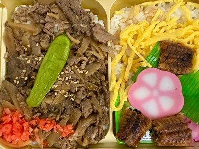 本日4食目。昼に買っておいた浜松三ケ日牛ごぼうしぐれ&プチうなぎ弁当。