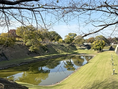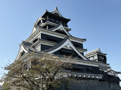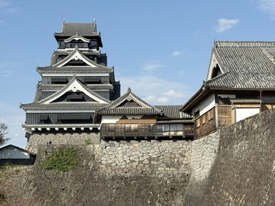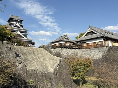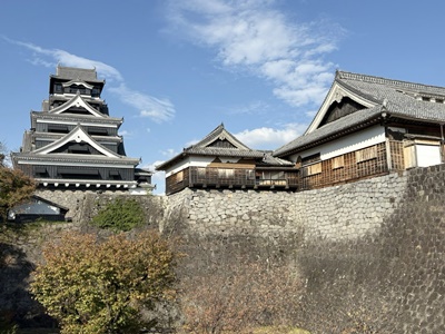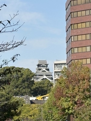 熊本城大天守も見える。チェックイン時間にはあと1時間ほどあるので先に行くか。2017年以来8年ぶり。